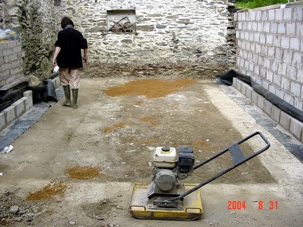 Levelling the floor, and putting down the sand to stop any stones puncturing the DPM